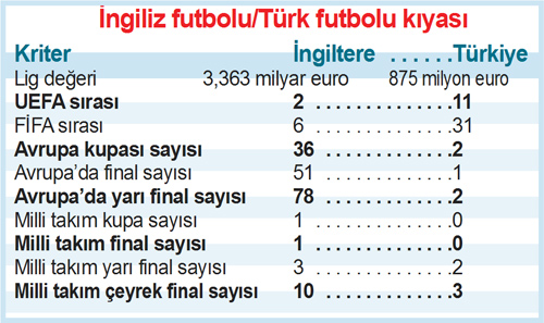 Öncelikle İngiliz futboluyla Türk futbolu kıyası biraz karmaşık bir mesele... İngilizler bu oyunun mucidi. Futbol, halen bu çağda bile Britanyalıların oyunudur; sahaya 22 değil 32 oyuncu çıkacak deseler, bir-iki kişiyi ikna edip kural değişikliği yapabilirler (Zira Futbol Oyun Kuralları’nı belirleyen 8 kişilik kurulun 4’ü hâlâ Britanyalıdır)... Ligleri bizim ligimizin 5 katı değerindedir; maçlarını 1 tv kanalı değil, 200 tv kanalı yayınlar. Premier Lig, 5 değil 55 yıl Avrupa’dan men edilse, döndüğünde yine Avrupa kupası kazanacak hacme sahiptir.