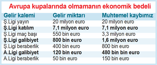 Biz Avrupa kupalarında olmazsak ödeyeceğimiz sportif bedelse biraz daha ağır olur: UEFA 11’inciliğinden 53’üncülüğe düşeriz. Şampiyonumuz, 5 yılın bitiminde Devler Ligi’ne girmek için 3 ön eleme oynar. Avrupa Ligi’ndeki 3 temsilcimizin de yolları daralır (Üstelik kulüp puanları da sıfırlanacağı için hemen hiçbir turda seribaşı olamazlar)... 2017-2018’den itibaren katılan takımlarımız her sene başarılı olsalar bile bugünkü durumumuza dönmemiz için ekstra 5 yıl daha gerek. Çünkü UEFA, ülkeleri yalnızca son 5 yılda kazandığı puanları toplayarak sıralamaya sokuyor. Yani bu cezayı almamız halinde Devler Ligi’ne tekrar direkt takım göndermemiz için bize gereken minimum süre 10 yıl...