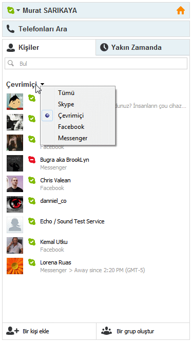 Aşağıdaki resimde gösterilen bölüme tıkladığınızda hangi kişilerin Skype kişi listesinde yer alacağını belirlemiş oluyorsunuz. "Çevrimiçi" seçeneğini işaretlerseniz çevrimiçi olan tüm Skype, Messenger ve Facebook (hesabınızı birleştirdiyseniz eğer) kişileri listede yer alacaktır.